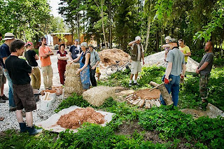 We turned it over to the Estonians at first trying out various mixing machines and cleaning methods, but nothing was quick and fast enough.  In the end, we actually found it easiest to use a pile of clay that had sat exposed to the Estonian winter and with the freezing temperatures it was broken up into enough small pieces that given a site-made Estonian tamping/smashing device we could mix them with water and screen them to the size we needed.  A little searching produced sand that was well enough graded for various applications.  One thing we did discover as the week went on was that Estonia readily has available crushed limestone that traditionally is used in lime plaster mixes and proved totally satisfactory for use with clay plasters. A lawn mower and different sized screens made for a tedious, but acceptable process for chopping straw.