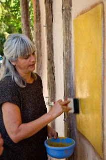 Marita Krull and Athena applying fresco color to lime plaster panel.