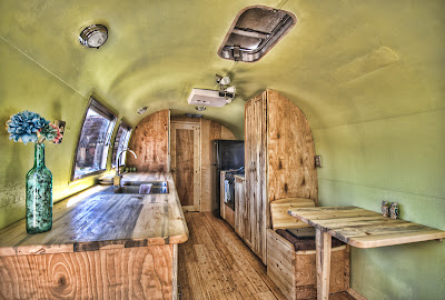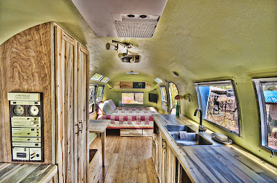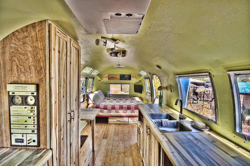 I keep thinking I should post something to my blog, our past 3 months have been ridiculously busy. Â However, I’m poised to fill in the blanks with a series of short posts of our happenings over the past several months. Â For today, partially because it doesn’t take much writing and I think the photos are fun, I’m posting a few of our son Arjuna’s (aka Oso) newly remodeled 1965 Ambassador Airstream trailer. Â He picked it up at the end of last summer, gutted it, and went to work earnestly on it early this past spring. Â From Canelo, he hauled it up to Santa Fe to live in while working off and over the next year. Â I don’t think I need to say more, the photos speak pretty much for themselves. Â His newly established business goes by the name – “Bearfoot Carpentry.” Â He’s got a great start, way more advanced than many woodworkers much older than he. Â So for the immediate, in addition to his cabinetry work etc, it appears he is also in the Airstream remodeling business.