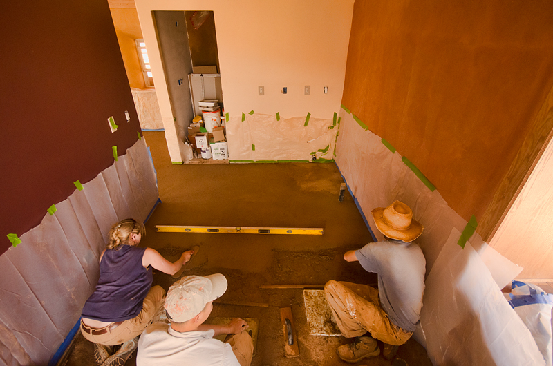 This past weekend I spent a day helping/teaching three young folks installing an earth floor in a 400 sf straw bale cottage belonging to 33 year old Nicole Davis. Â Short of installing the kitchen cabinets and sink, this was the last step in finishing her little building, mostly self-built, after a couple of years of hard work. Â It always amazes me what can happen and how much people can do with a little guidance and good technique. Â So I thought I’d post a few photos from the day and its progression.