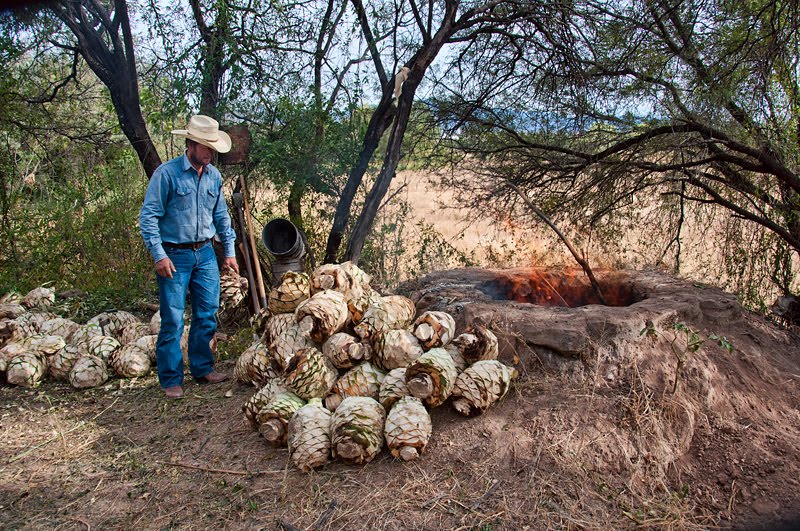 The hearts (“cabezas”) of the agave plant ready for roasting in the pit with the fire. Once cooked, they are fermented and then distilled to make mescal Bacanora.
