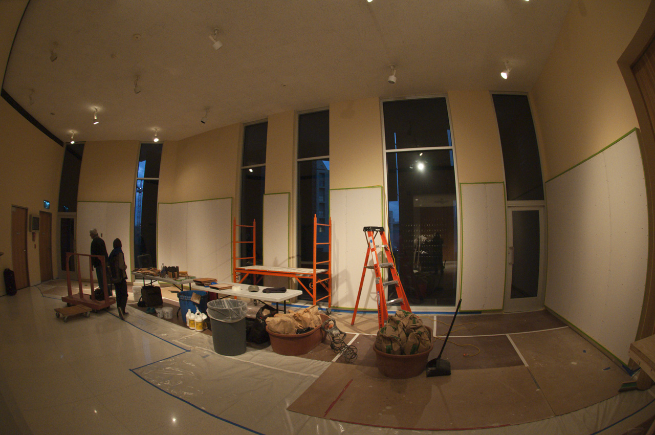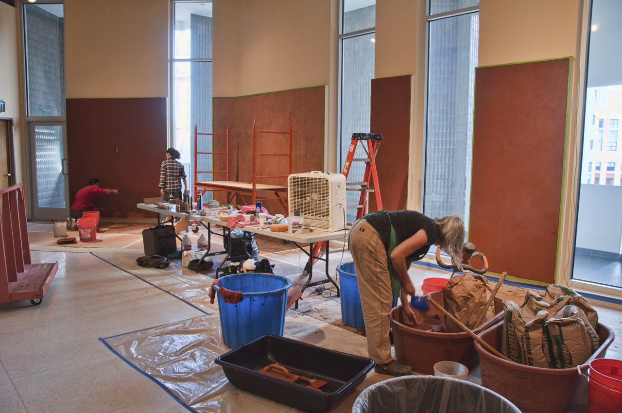 We needed one day to gather materials, 3 days to plaster the wall panels. The week went fast. Plastering over drywall is fairly easy work for us, the surface is flat and easy to cover. And yet, we finished without minutes to spare. For those interested in the plastering details, I’ll do another short post on the mixes we used and how we did it. In short, it was fun and thankfully, the museum made us vacate the space at 5 pm, which for us was a great measure of control in that we’re not the best when it comes to stopping work at a reasonable hour.