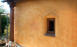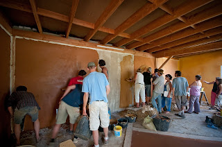 The bagged white kaolin clay proved to be somewhat problematic. To put it in plain language, kaolin clay is one of those clays that you might describe as being “too well behaved.” What I mean by that is that when mixed with water, kaolin clay doesn’t expand a great deal nor shrink excessively when drying. Therefore it is not very susceptible to cracking. On the negative side, it is not very plastic, workable or strong. It lacks some of the desirable qualities one would like to have in a clay that is used for plaster. Consequently, we struggled for a day figuring out how to work with it. To give us a little more flexibility we decided to process some brown clay that Andre’ had soaking on site. With that addition we had what we needed. On the other hand the kaolin clay did work quite well when mixed with lime for a lime/clay plaster and as many people know, it works well for thin finish coats and paint.