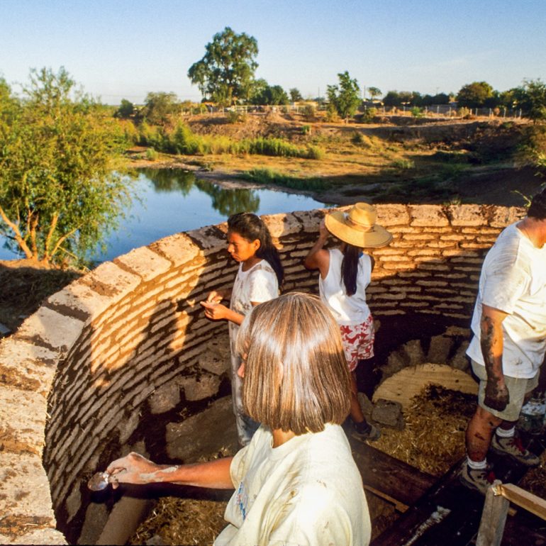 There were two very important lessons that we learned on that project. One was that the straw/clay blocks didn’t have the compressive strength needed. Over time, they began to settle and weaken the structure of the dome. The second was of equal importance. It was easy to build the dome, but to cover it with a weather-proof coating was extremely difficult. As was the case with the majority of lime plasters we tried in Mexico over earthen materials, the delamination of the plaster remained a continual problem.