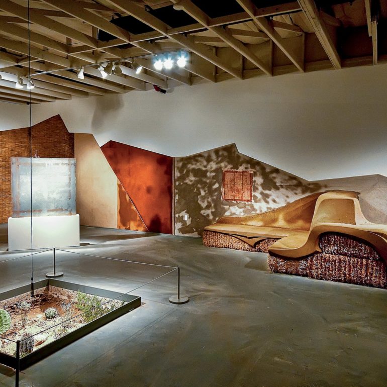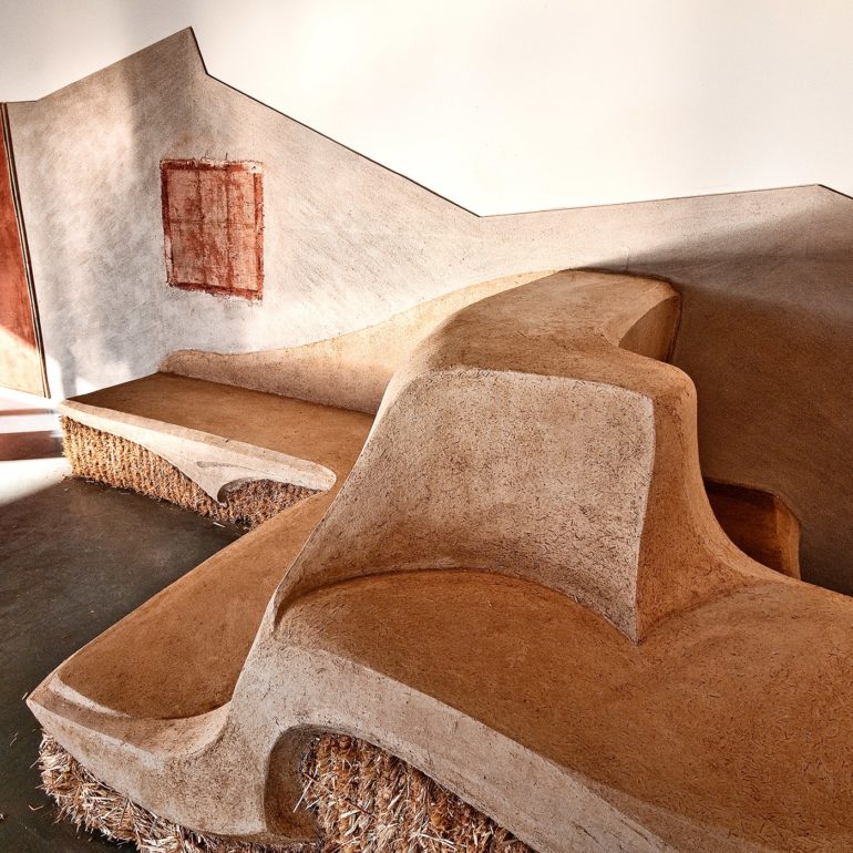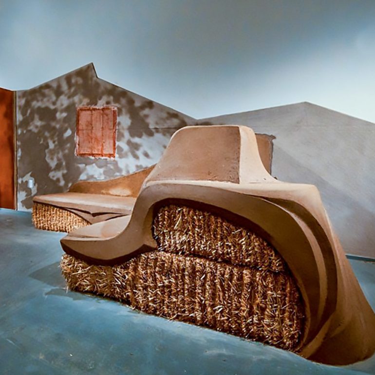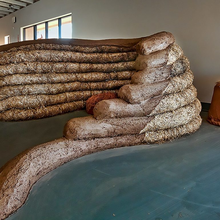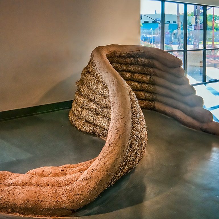 Without much of a plan we lined up the materials – clay, chopped straw, bamboo poles, reed mats, straw bales and a new element we had not used before -straw wattles (typically used for erosion control.) We began by creating a backdrop for the concrete piece and the pods by plastering creative shapes on the existing walls. We sculpted a straw bale bench to provide seating for visitors along with a sculpture out of the wattles that was just inside the entrance. We also brought in our friends Joe and Rebecca Ewan, professors of Landscape Architecture at ASU, to landscape the barren space left by removing the concrete from the floor. More in-depth descriptions of the exhibition can be found at these pair of blog posts.