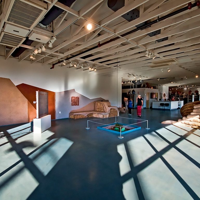 Post Commodity began the project by cutting a 4×4 ft hole in the concrete floor of the museum and stood it upright on a pedestal. There was an audio recording of a Pee Posh social dance performed by the collective. Never meeting any members of the group or discussing with them anything about the meaning of what they had done, we assumed it implied getting back to the earth. Nora and her group had created a series of clay and fabric sculptures called “Pods,” that contained seeds to imply growth.