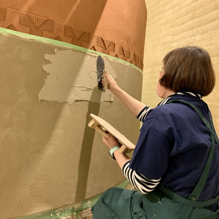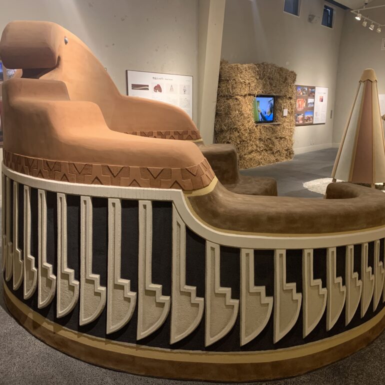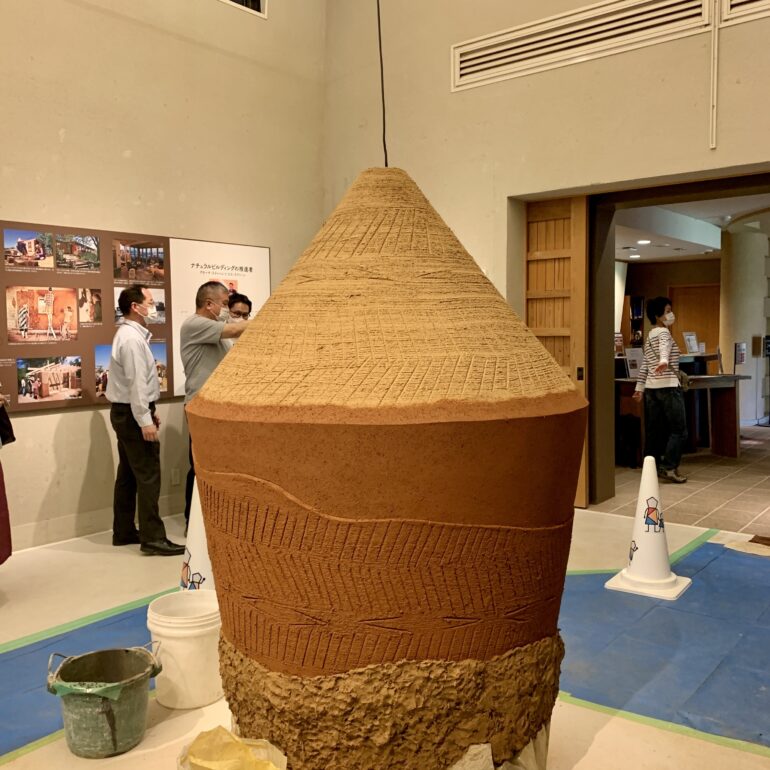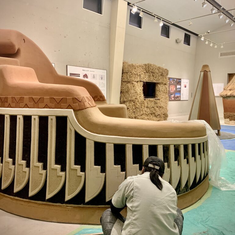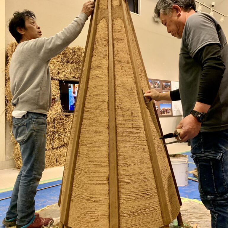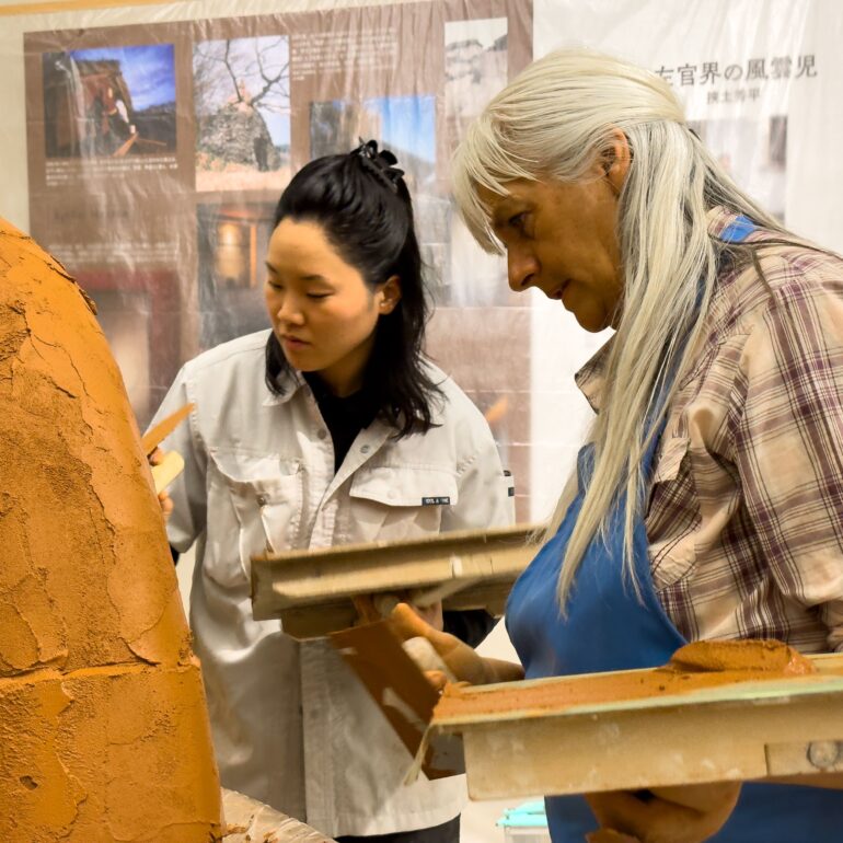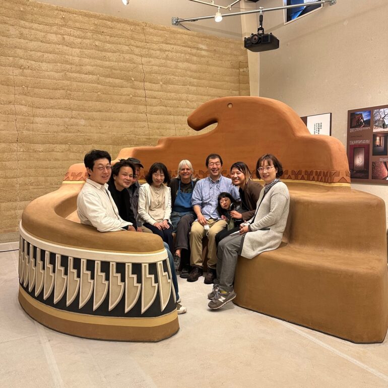 In spring 2023, Athena and Bill visited Japan for the first time as visiting artists for “Rooted in Clay,” a collaborative earthen art exhibition held at the INAX Museum in the pottery town of Tokoname, Aichi. The museum, dedicated to the many-faceted world of clay and ceramics, hosted an exhibit that would highlight the expression of clay through various cultures. Three sculptural forms were worked on by each artist representing their culture; Athena Swentzell Steen, a Native American from Santa Clara pueblo, Bill Steen, from Mexico decent, and Syuhei Hasado, from Japan. The exhibited works were completed after eight days of public work.