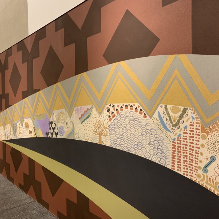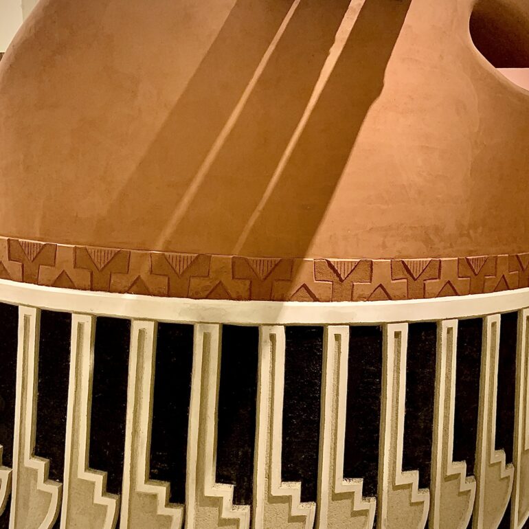 Mountain Bird was inspired by this kiva. On the outer rim, Athena plastered bird feathers using a technique she calls “carving,” in which white clay is applied over and over again on top of black clay to make it thicker, and then carved out as it dries. This “mountain bird” has blue “glowing mud balls” for eyes, it seems to naturally invite people in and take them to a different world.