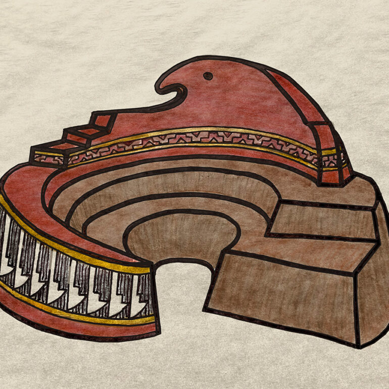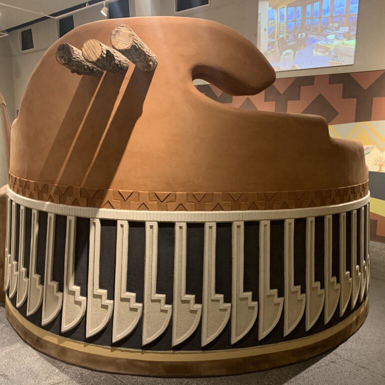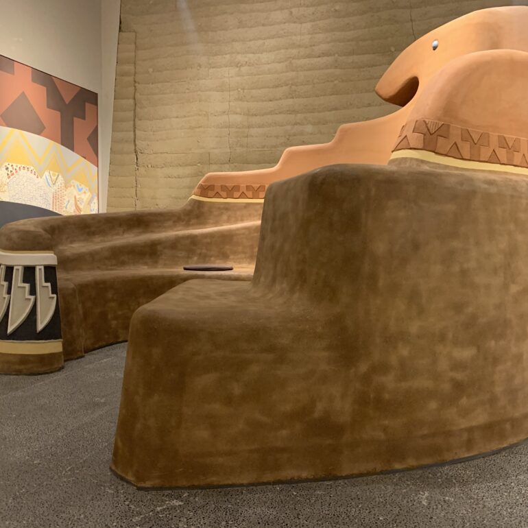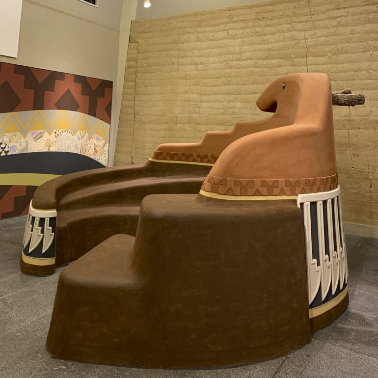 In the center of the Native American and Pueblo communities, there is a ceremonial meeting place called a “kiva”. It is circular in shape and surrounded by stepped rooms. When accessing it, (one) descends from the top into the dark womb of the earth and reappears on the way up. On entering and exiting, one is purified with smoke and blessed with the feathers of a bird that “possesses the intelligence to see beyond”.