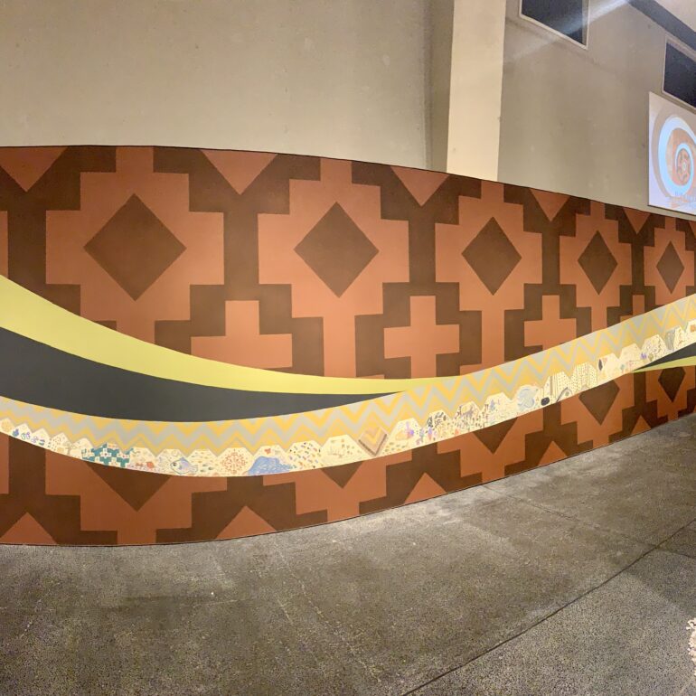 The stepped-mountain design common in Pueblo pottery, weavings, and building design depicts the sacred mountains surrounding Pueblo communities. The diamond represents Earth- its four points corresponding to the four directions–north, south, each and west. Its center being where all directions converge. The background pattern combines the elements of physicalness and space to embody the total interconnectedness of people and nature. A double-stranded river runs over and across the background. One strand of triangles, a symbol of rain and clouds, flows with the essential power and energy of life-giving water. The other strand, protected beneath, is a defined yet unknown stream of raw, creative spirit.