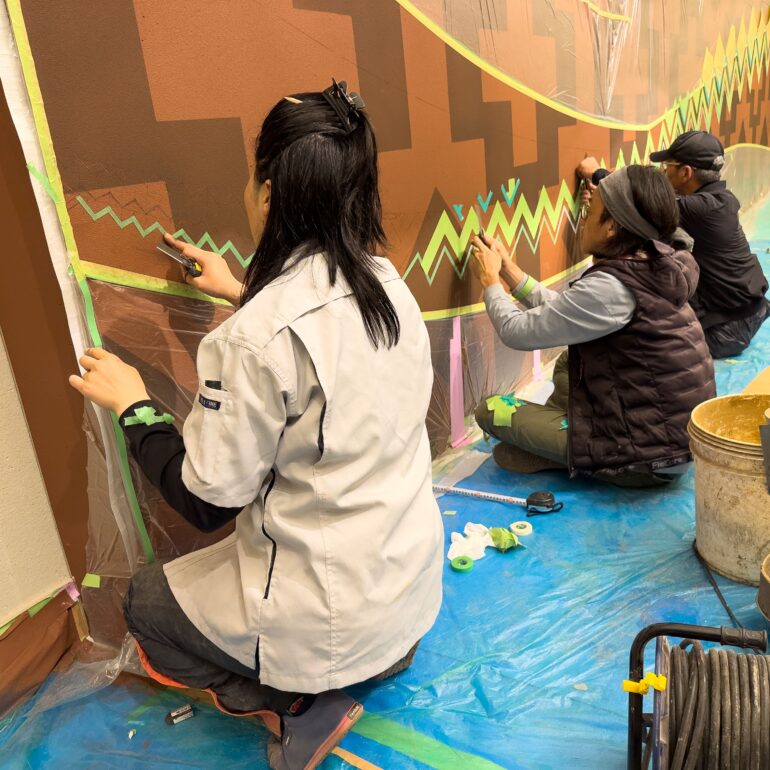 This work was intended to show the characteristics of Japanese plastering. The conical base, which resembles a bamboo komai, was created from Athena’s image sketch, and Hasado developed it into a Japanese umbrella. The finishing touches were done by Hasado and his trusted plasterer, Masaki Kawaguchi, working in tandem. Japanese plastering is characterized by smooth surfaces and straight lines. The zigzag tops, eight bones, horizontal bottom edges, and other minute details were formed by timing the order of application, applying molds and using a small trowel each time. The top coat on the flat surface was finished delicately and elegantly using three colors of clay.