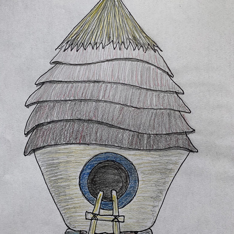 Mountain Bird. The lower half represents the wings of a bird, and the upper part represents a mountain. The logs sticking out of the upper part of the structure were made to resemble beams in an adobe structure. The upper half is plastered with Hida red clay.