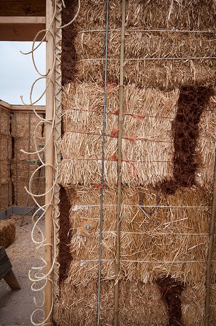 On Friday we worked the full day at the site. The first half of the day was spent filling the gaps in the walls between the straw bales with a mix of straw and clay, attaching sisal rope to all the wood framing members to make a connection with the clay plaster, detailing the window opening and assorted other odds and ends.