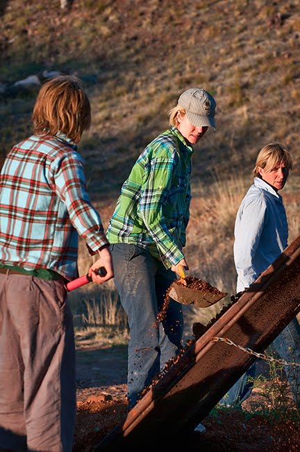 The girls Monica, Julie and Tracey screening clay soil through a quarter inch screen for use with plaster and clay slip.