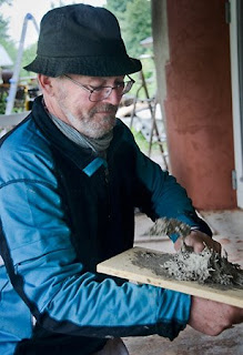 We used a variety of mixes on the walls around the house, trying to match mixes to weather exposure. I’m going to give you the recipes for the plasters that we used, but “please†keep in mind that all clays are different and these proportions will vary depending upon the qualities of the particular clay. Most every mix excluding finer mixes for carving and smooth finish coats we sieved or screened the sand through 1/8 inch or 3 mm screen. The clay was already in paste form. For the front and back walls that are protected under porches and needed no stabilization we used the following proportions. 1 clay, 3 sand, 1 straw, ¼ hemp fiber for fun.