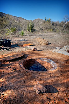 Baking pit for the agaves and Roberto with chipper shredder in background.