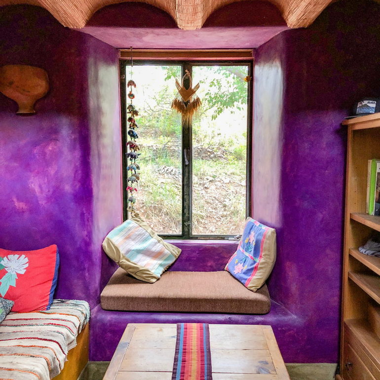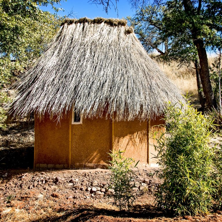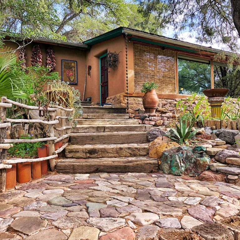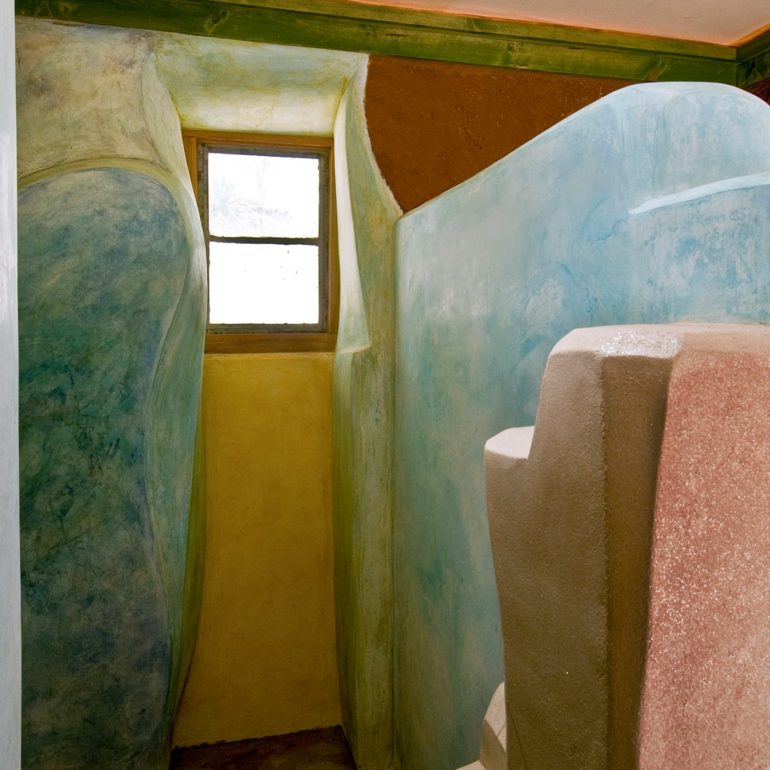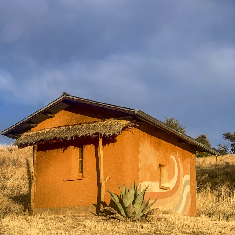 There are more than a dozen straw bale sheds and cottages on site. The main house and guest house are primarily adobe.