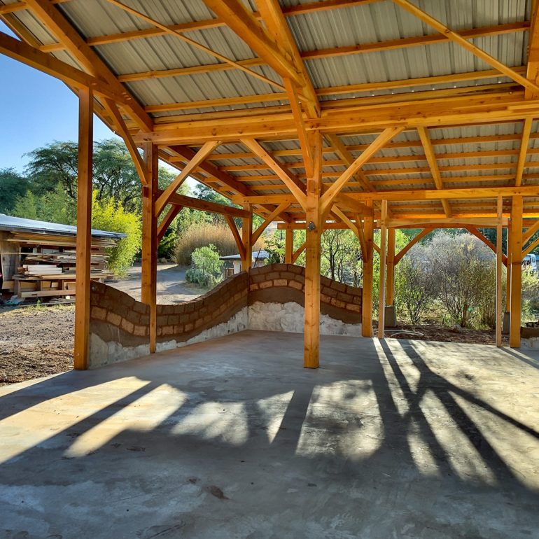 We welcome you to come take a tour of our several small experimental buildings. A variety of natural building techniques and finishes can be seen.